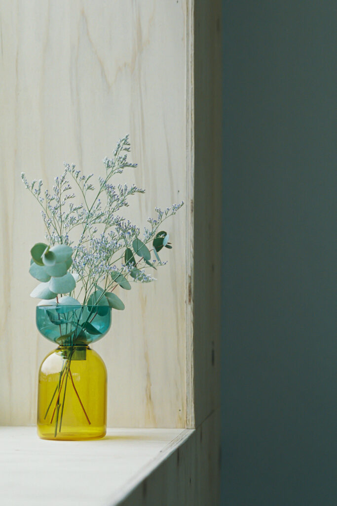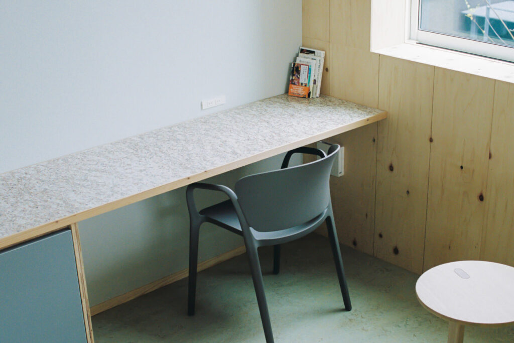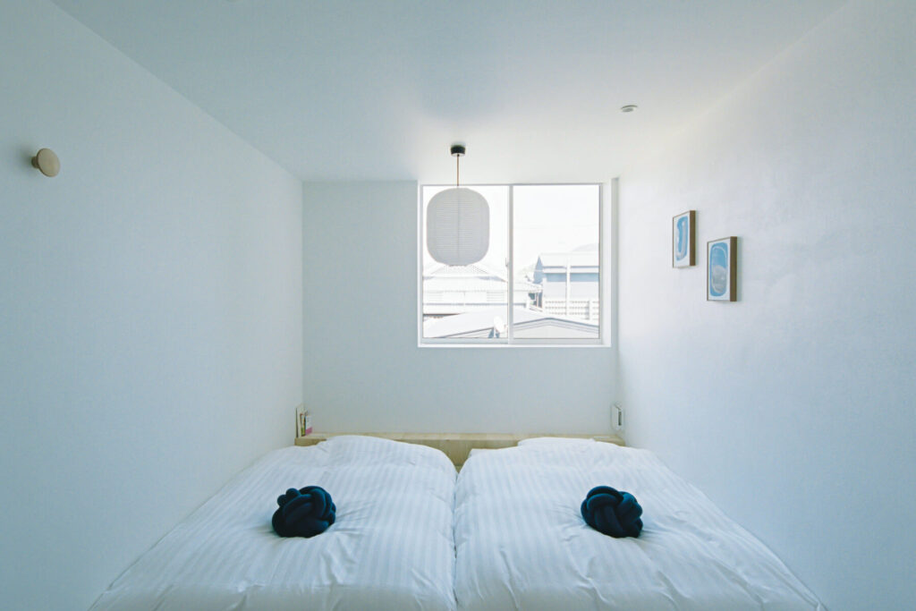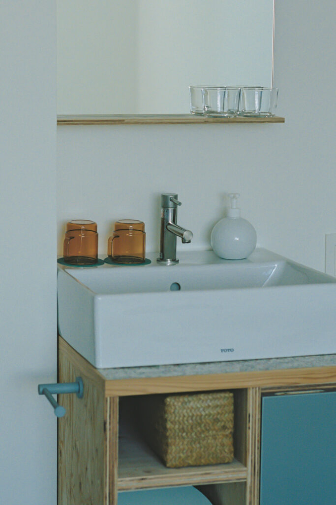 『豊かなミニマルな暮らし』をコンセプトにしおまち商店街に暮らすような体験を目指し計画。外壁には地域の景観に馴染むよう焼杉を採用。またその焼杉はSoil瀬戸田スタッフや地域にてインターンに訪れていた学生、ショップハウスプロジェクト関係者を招きワークショップにて製作したオリジナル材。客室内部に使われている杉材や檜材と併せ、岡山県西粟倉村・森の学校と提携し材料を供給頂いた。地元由来である瀬戸田漆喰もオリジナルで製作し、瀬戸内地域を軸に地産地消を実施。