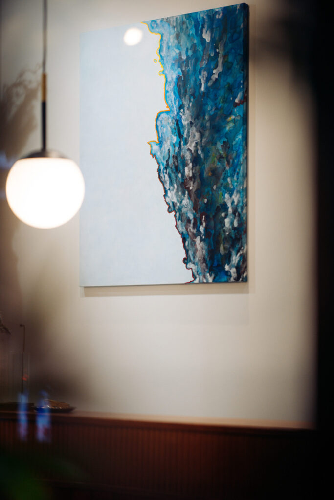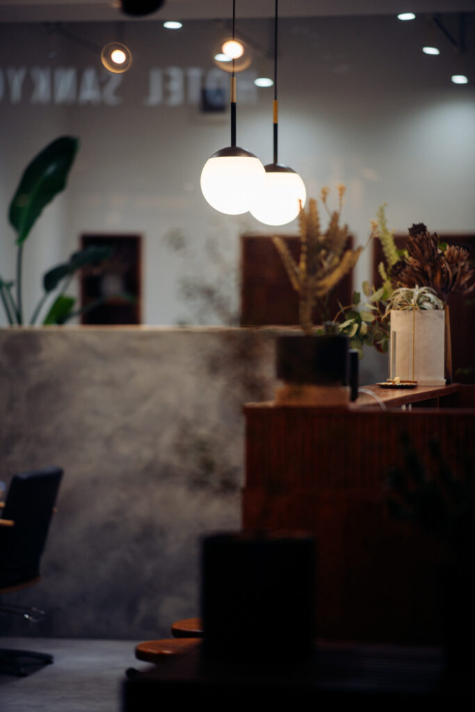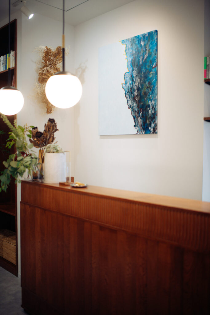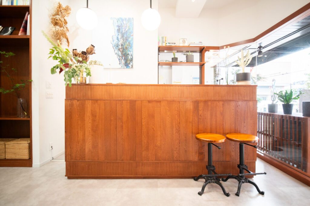 内部は背景紙になるような、ホワイトベースにツヤ感のある木製家具・建具を製作、塗装を複数レイヤーし光沢を出すことで、カジュアルと大人な雰囲気の2面性のある店舗に仕立てました
